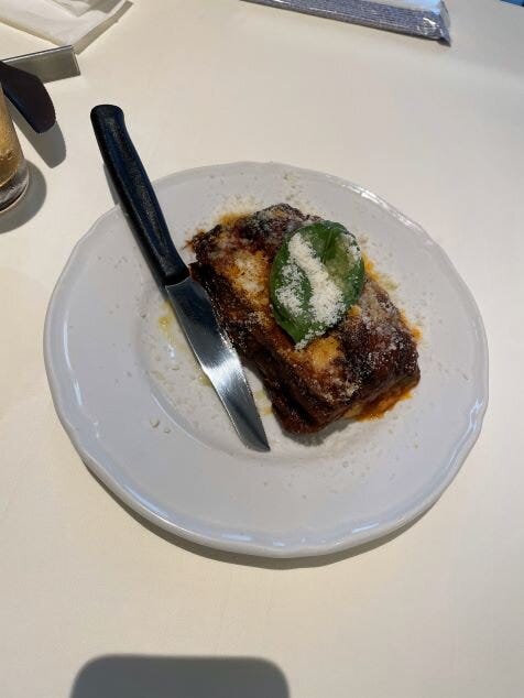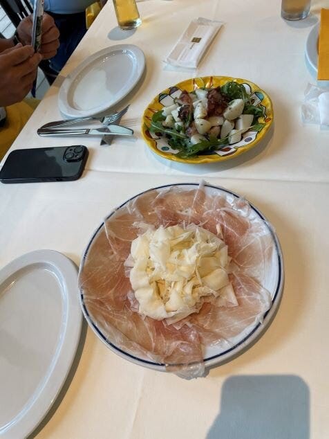 最初に、桃とモッツラレラのサラダを食べましたが、相性抜群で桃は甘くて美味しくて素敵なメニューでした。
