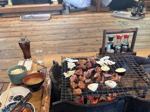 お昼は、鶏炭火焼らくだ山で地鶏を食べてきました。